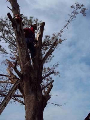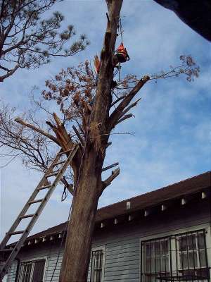 Curtis cuts down a tree, roping it down in a very tight spot.